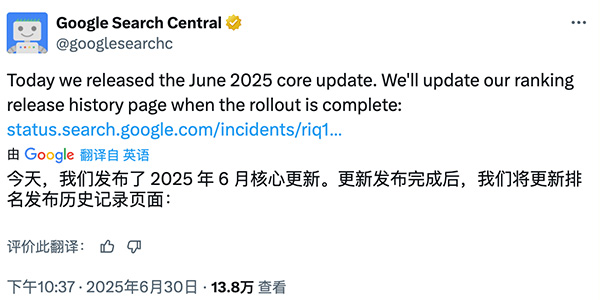 谷歌于2025年6月30日发布了新一轮核心算法更新(June 2025 core update)。根据谷歌官方的Search Status Dashboard,本次更新预计将持续3周才能逐步完成。这也是谷歌在2025年度的第二次核心更新。